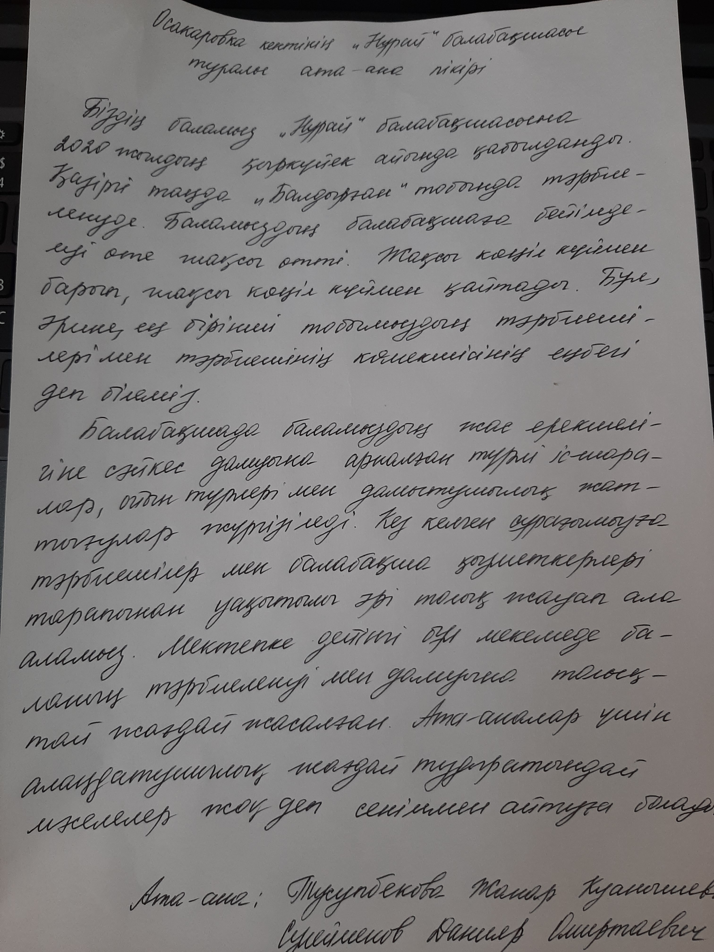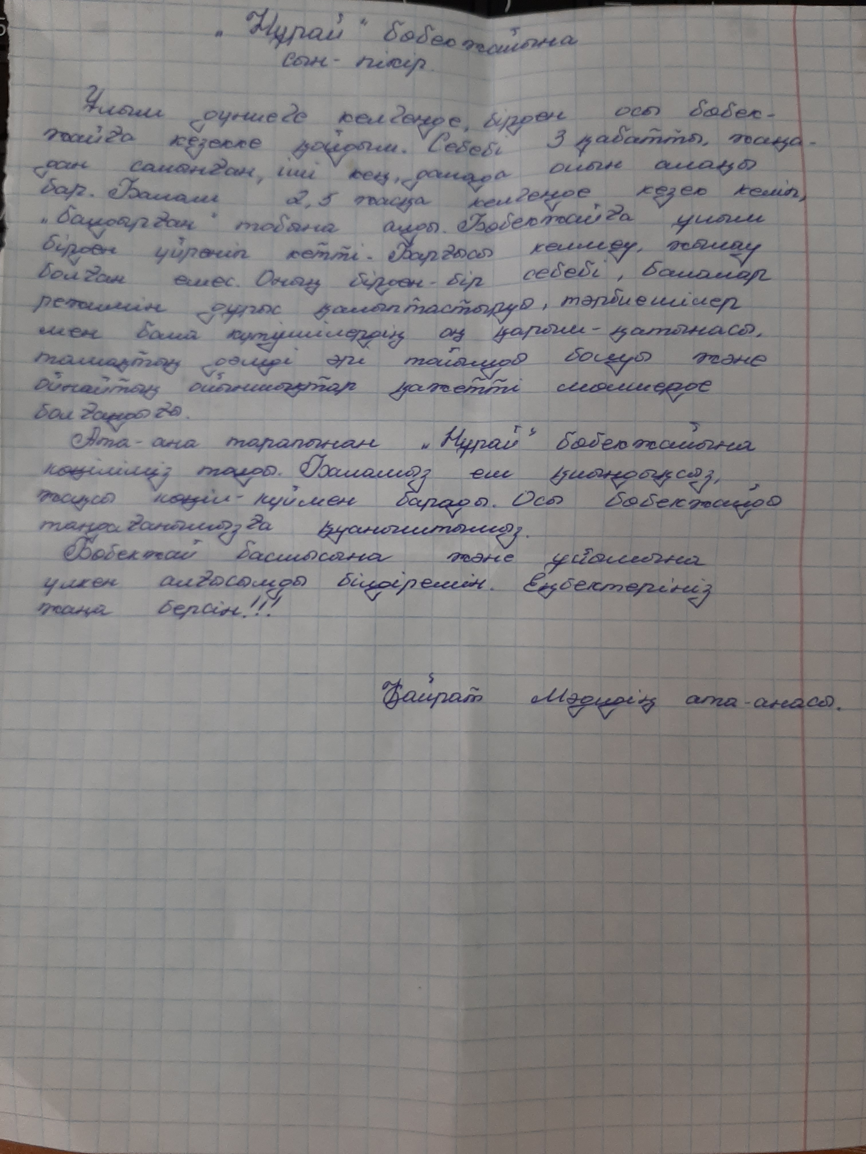 Менің ұлым Аслан "Нұрай" балабақшасына келгелі 2 аптадай болып қалды. Балабақшаға бейімделуі жақсы деңгейде өтті. Балалармен тату ойнайды, олармен жақсы қарым-қатынаста. Тәрбиешілеріне де үйреніп қалды, айтқандарын тиянақты орындайды, сабаққа да зейін қойып тыңдайды. Жалпы соңғы кездері әр нәрсеге қызығушылығы артып келеді, сұрақ қою арқылы бәрін білгісі келеді. Талпынысы бар. Тәрбиешілеріне және көмекшісіне алғысымды айтамын!